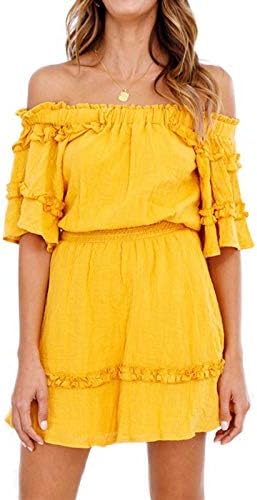 Stlyq Vestido De Mujer Amarillo Nuevo Solido De Volantes Cuello Slash Fuera Del Hombro Cintura Elastica Mini Vestidos Cortos Mujer Playa Sundress Xl Amazon Es Deportes Y Aire Libre