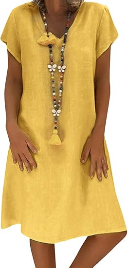 Orandesign Vestido De Verano Vestidos De Lino Senoras Con Cuello En V Vestidos De Playa Color Solido Vestido Acampanado Boho Vestido Largo Hasta La Rodilla Casual Manga Corta Mini Vestidos Sueltos Amazon Com Mx