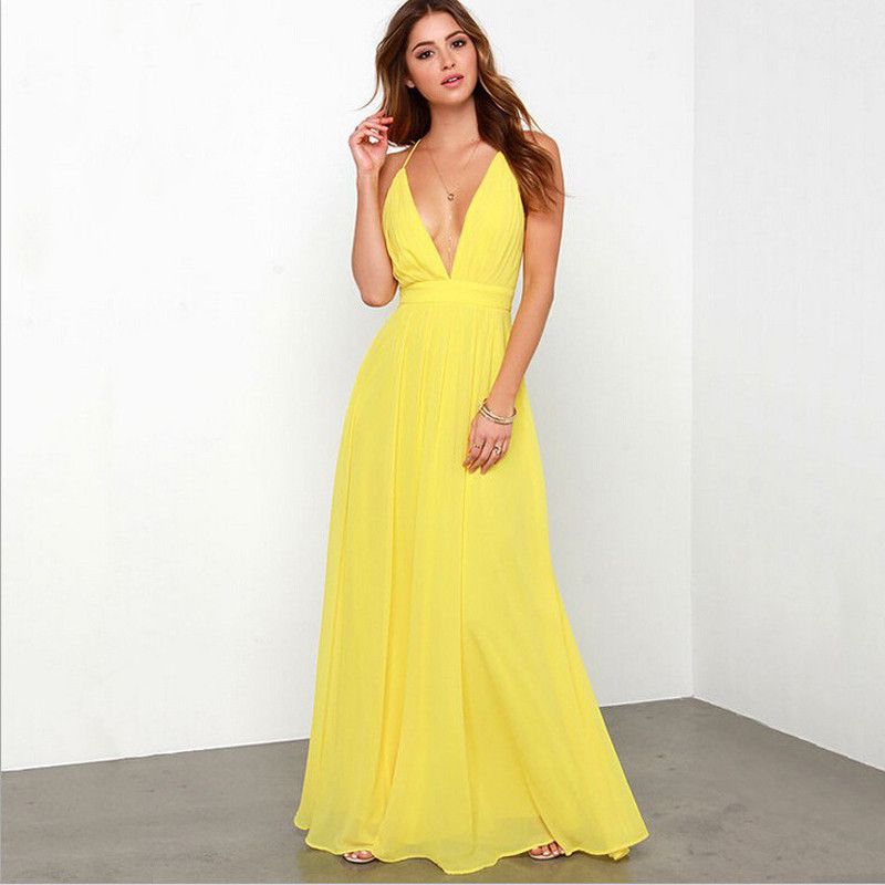 Compre Sexy Barato Amarillo Backless Damas De Honor Vestidos Profundo Cuello V Spaghetti Chiffion Playa Vestido De Dama De Honor Correa Cruzada Para Los Vestidos Del Banquete De Boda A 74 14