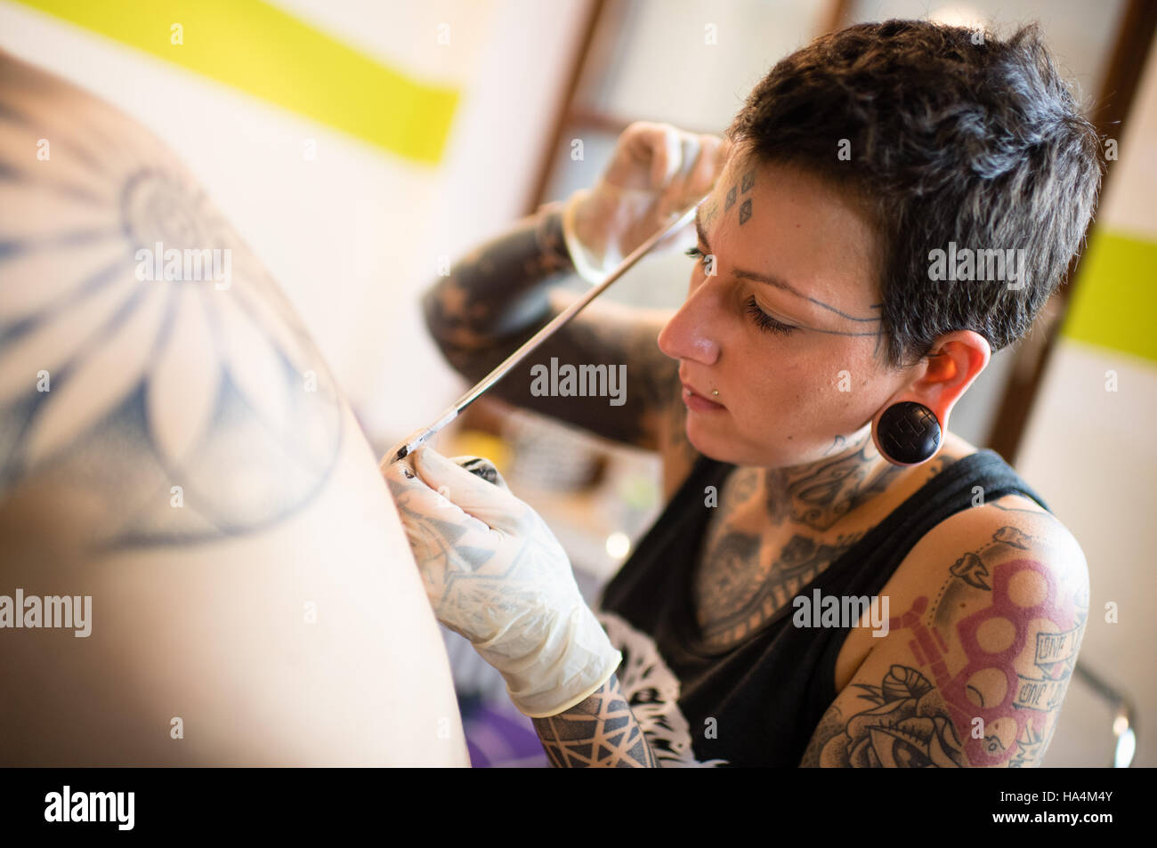 Grafing Germania Xvi Nov 2016 Tattoo Artist Georgina Ostheimer Funziona Su Un Tatuaggio Sul Retro Di Un Uomo Con La Speciale Di Tick N Poke Tecnica Di Bambu In Grafing Germania 16